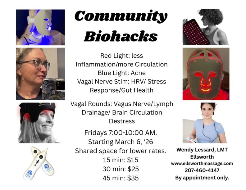 So happy to be bringing these Biohack supports to the Downeast region at affordable pricing. "Community" means you may share space, still giving you a tranquil setting to decrease your stress, decrease inflammation, improve circulation, strengthen your Vagal Nerve, treat acne, and support lymphatic drainage. I've been using the red light and microcurrent for a few months now and loving the results. If you've been tempted to try red light, try it with low cost to you to see what you think. I'm also a proud affiliate of Fringe Red Light and can offer you a 15% discount if you order with them @ fringeheals.com. No walk ins - by appointment only